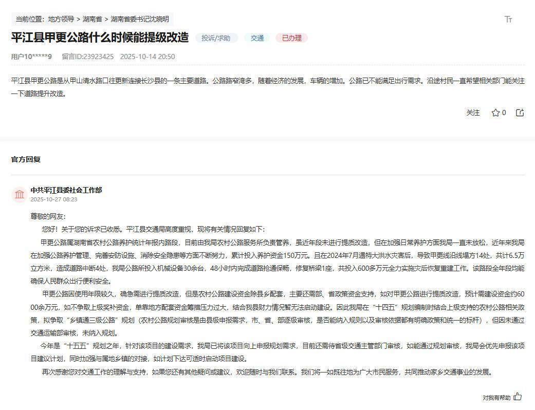 网友留言及官方回应截图东说念主民网长沙10月31日电 (记者向宇)“平江县甲更公路已不成逍遥出行需求,提醒什么工夫能提质修订?”近日,又名网友将湖南省岳阳市平江县甲更公路的近况,一键送至东说念主民网“指点留言板”湖南省委布告沈晓明的“案头”。