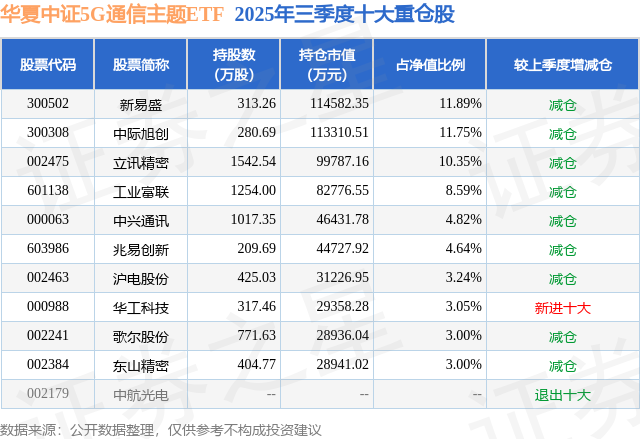 从基金规模来看,中原中证5G通讯主题ETF基金2025年三季度公布的基金规模为96.4亿元,较上一期规模67.4亿元变化了29.0亿元,环比变化了43.03%。该基金最新一期钞票成立为:股票占净值比99.53%,无债券类钞票,现款占净值比1.0%。从基金捏仓来看,该基金当季前十大股票仓位达64.33%,第一大重仓股为新易盛(300502),捏仓占比为11.89%。