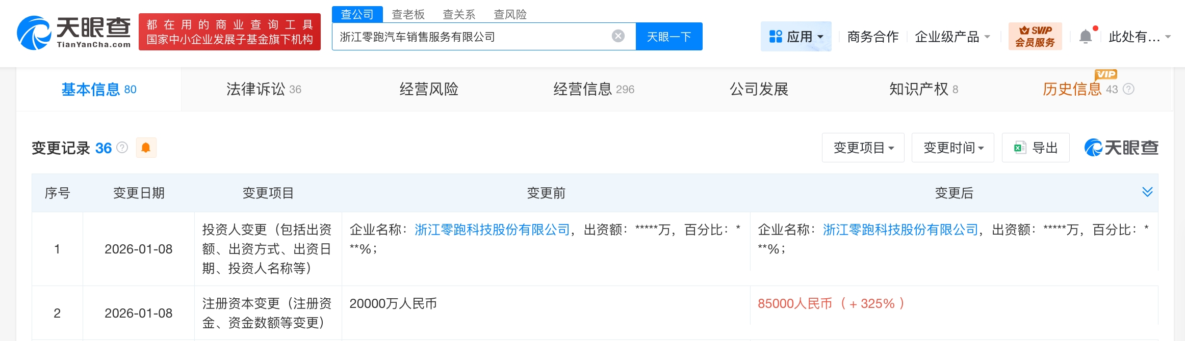 南边财经1月9日电,天眼查工商信息表露,近日,浙江零跑汽车销售劳动有限公司发生工商变更,注册成本由2亿东谈主民币增至8.5亿东谈主民币,增幅325%。该公司确立于2018年8月,法定代表东谈主为徐军,预料限度含汽车零配件零卖、汽车庇荫用品销售、汽车零配件批发、新动力汽车整车销售、新动力汽车电附件销售、机械电气蛊卦销售、互联网数据劳动等。鼓励信息表露开云体育,该公司由浙江零跑科技股份有限公司全资握股。