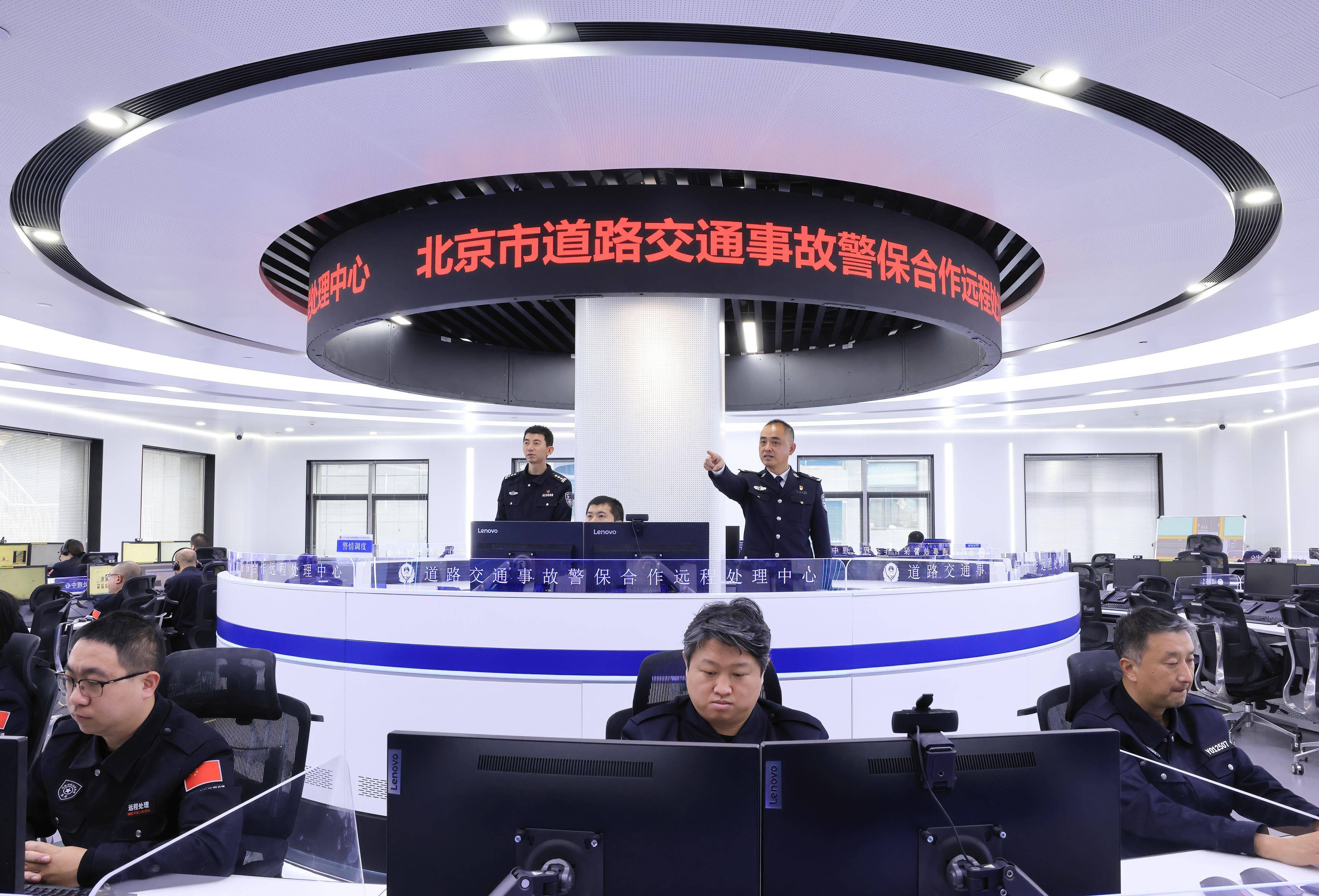 1月6日,在北京市说念路交通事故警保互助良友处理中心,北京市公安局交通经管局事故处处长于海涛(后排右)与民警总共转念全市渺小交通事故警情良友处置使命。新华社记者 殷刚 摄依托警保互助“一站办”机制