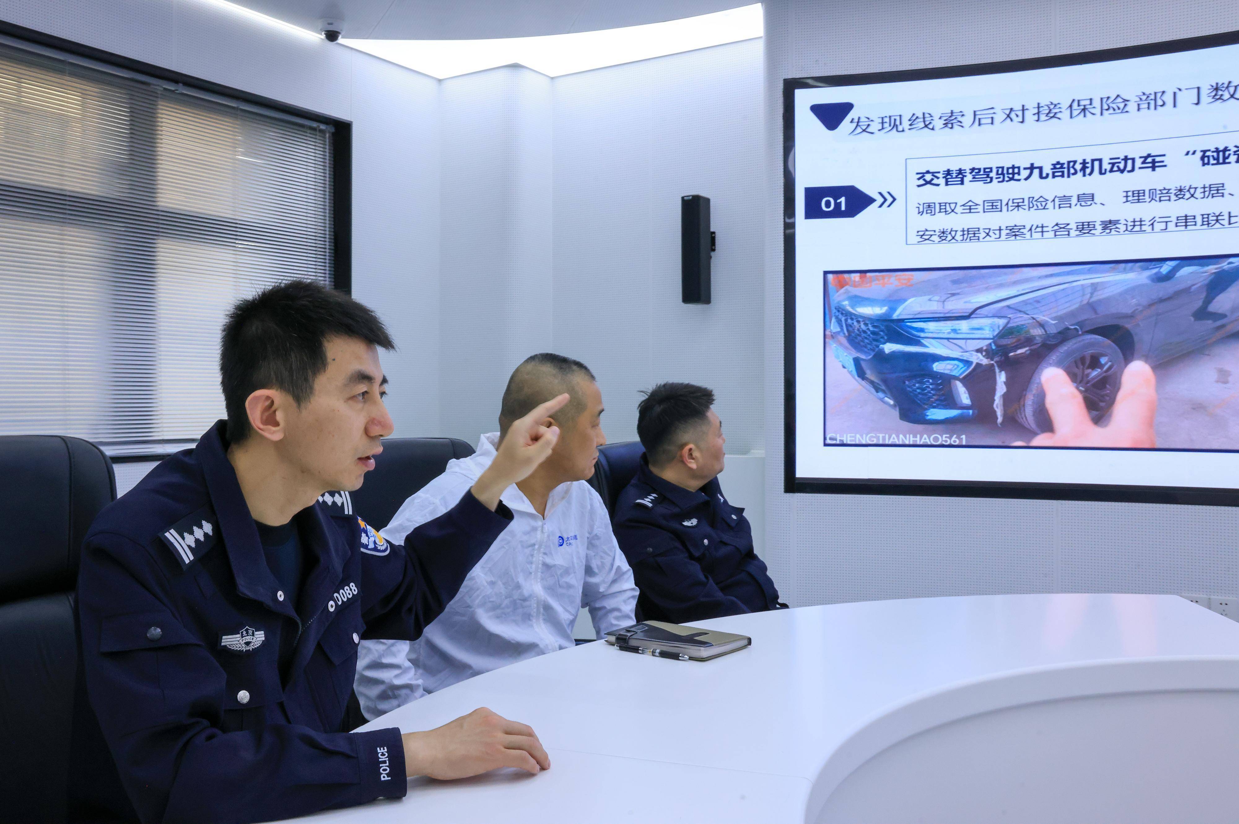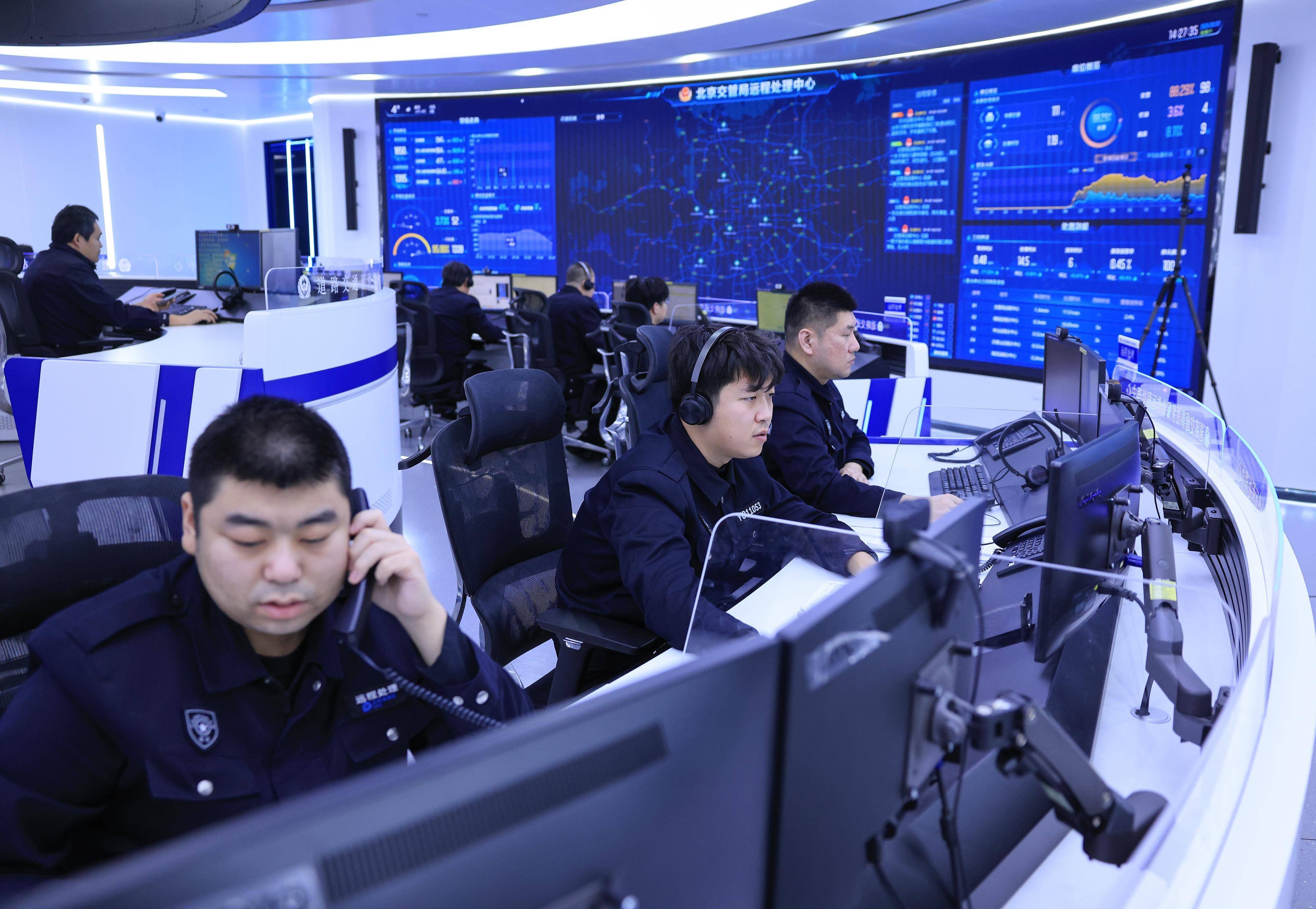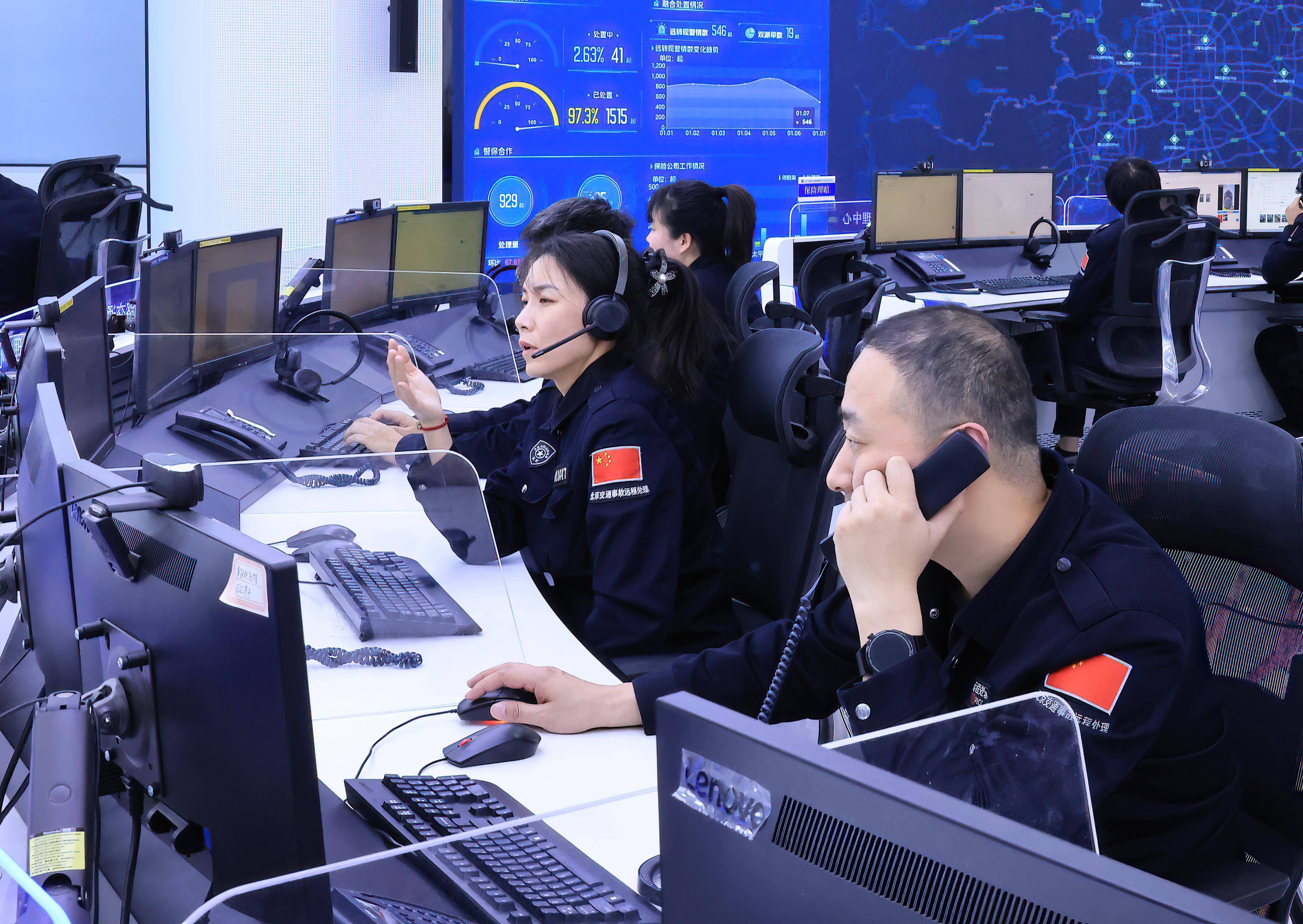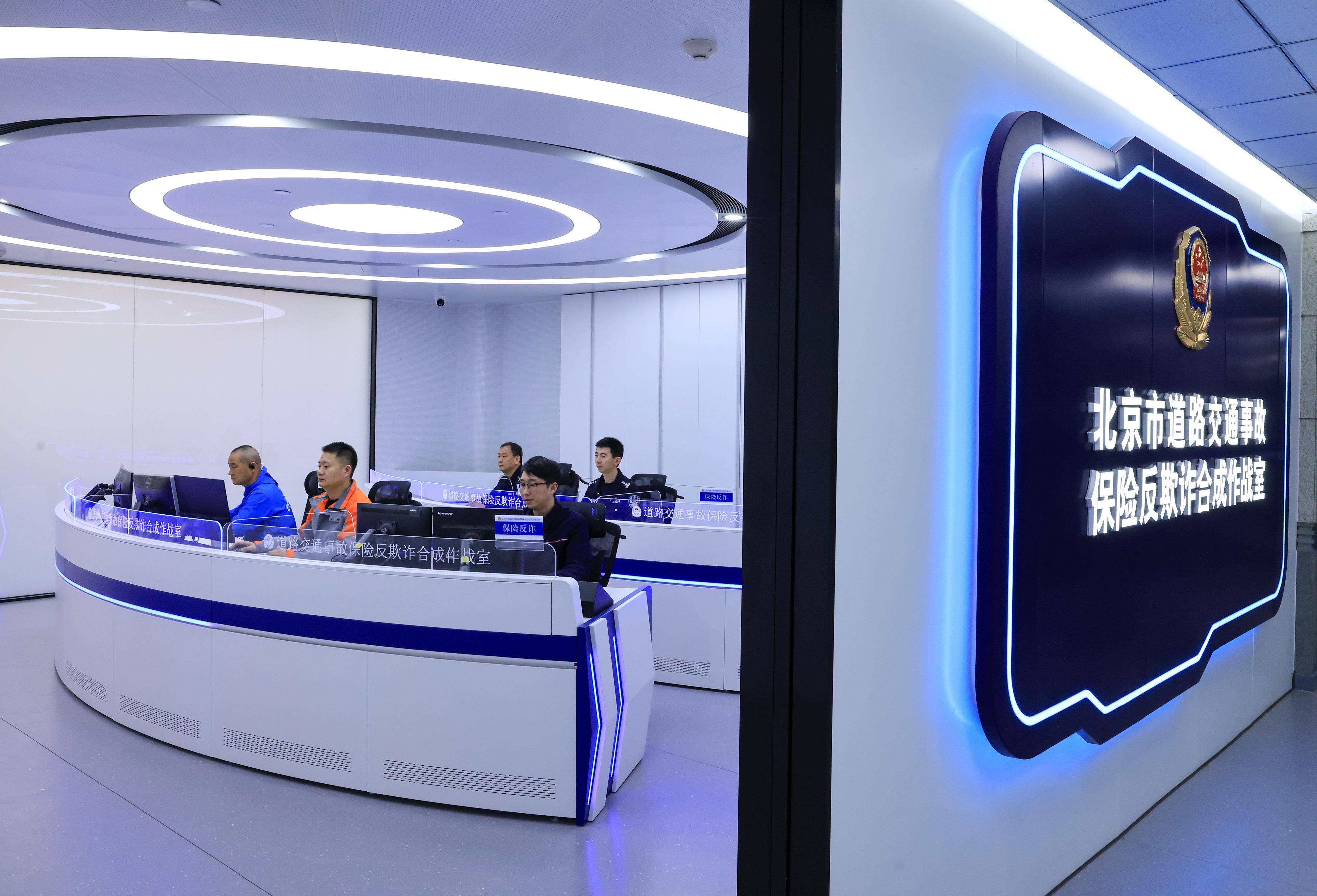 1月7日,在北京市说念路交通事故警保互助良友处理中心的交通事故保障反诓骗合成作战室,民警与使命主说念主员在分析研判有诈保嫌疑的交通事故。新华社记者 邢广利 摄