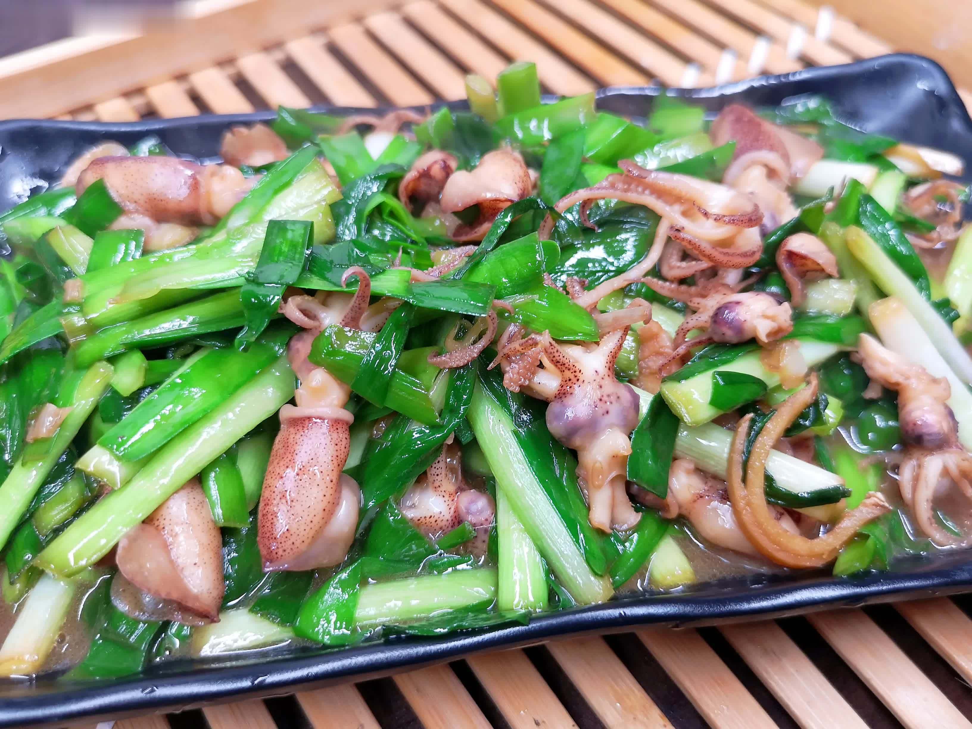 4. 随即加入焯好的海兔,沿锅边淋一勺生抽、一丝盐,快速翻炒均匀就出锅。全程不要向上一分钟,韭菜脆嫩、海兔Q弹,鲜得很。