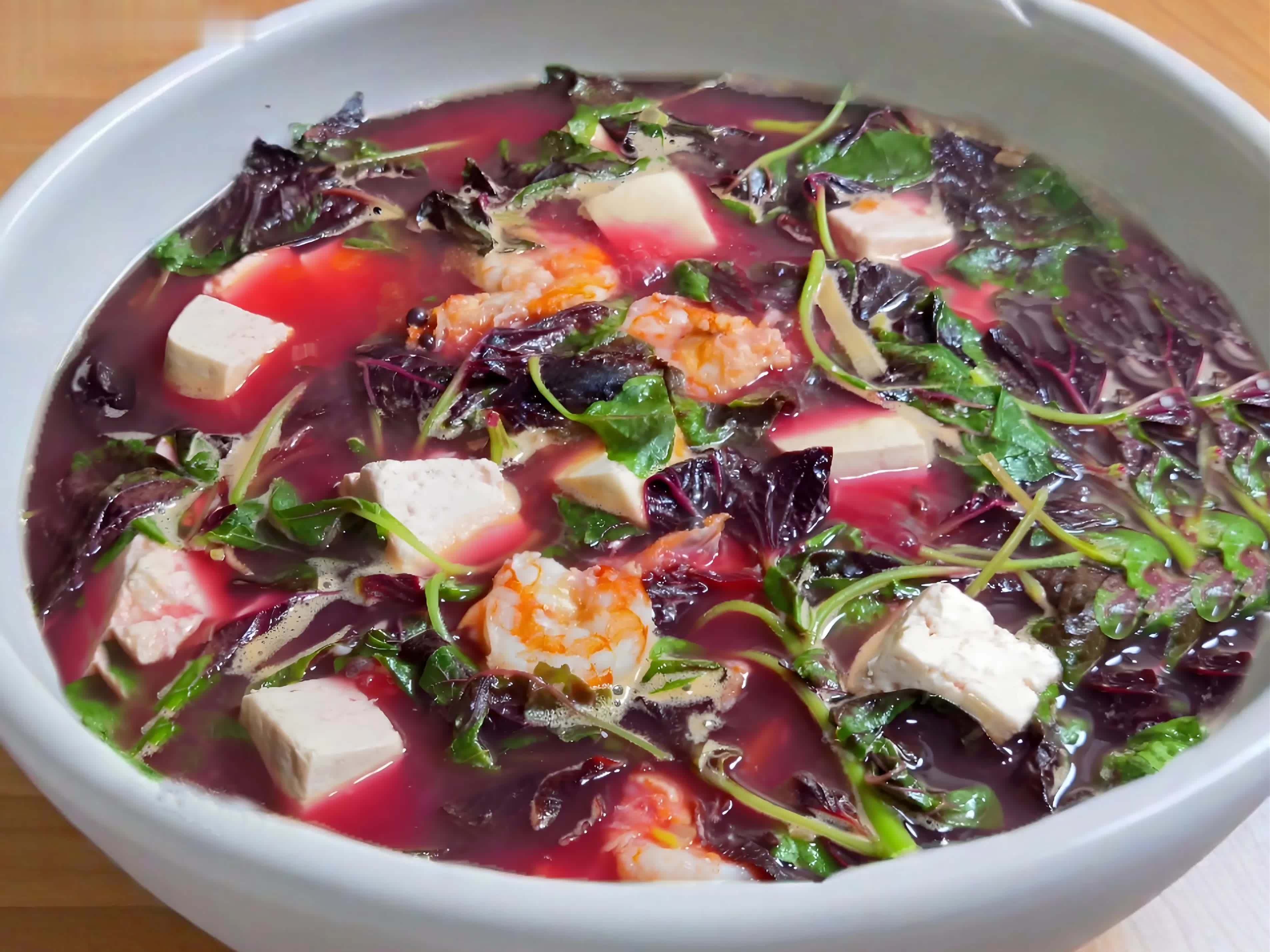 4. 把红苋菜放进去,烫软就关火,加盐和一丝点白胡椒粉调味。汤色粉红,苋菜软滑,豆腐嫩,虾仁鲜,喝一碗至极适意。